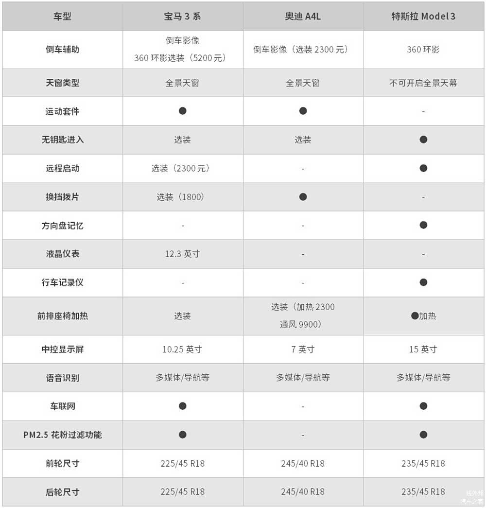 可以看到,在偏向驾驶层面的配置上,特斯拉有一些优势。宝马3系将之前的座椅侧翼调节取消,换挡拨片变成选装,让人有些遗憾。奥迪A4L在配置方面不占优势,或许在厂家看来,真正买四驱的人在乎的是驾驶的纯粹,已经不在乎配置了吧。想要配置的人,两驱有大把车型可选,还更便宜。