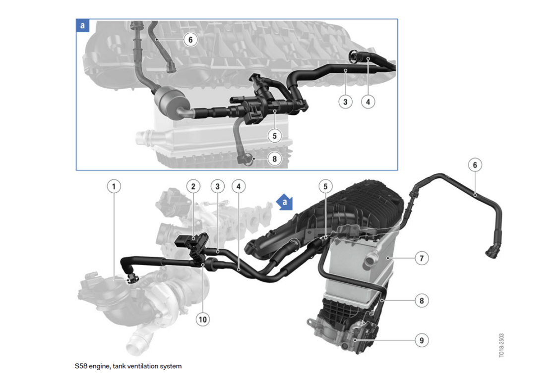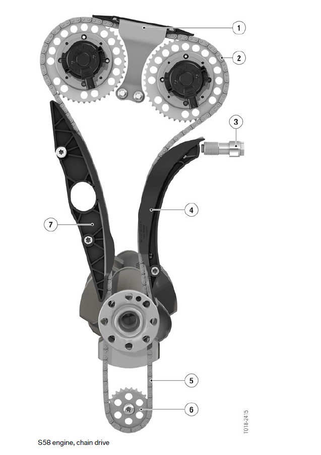 根据宝马官方对 S58B30A 的表述,它是 S55 家族的直接继承人;同时正如后者以 N55 发动机作为开发蓝本一样,咱们的主角 S58B30A 也是与改进版 B58TU 发动机同步开发而来的。我们可以从正时链条及其张紧器设计、双 VANOS 可变气门正时系统、Valvetronic 可变气门升程机构、350 巴高压燃油直喷系统、封闭式水道设计以及传达皮带布局这些地方看出 S58B30A 与 B58TU 的亲缘关系。