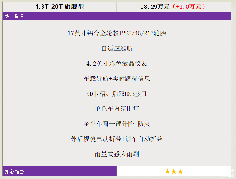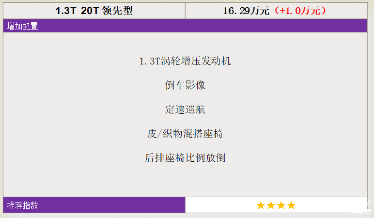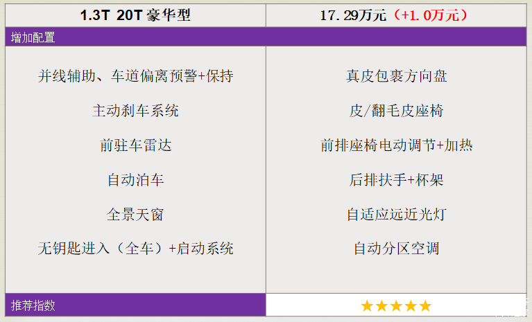 1.3T 20T 豪华型,较领先型售价提升了1万元,