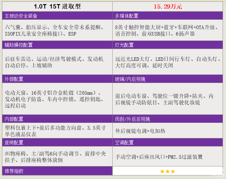 其中1.0T三缸直喷涡轮增压汽油发动机,92kW/5800rpm,180N.m/1350~4500rpm,匹配6AT变速箱,售价15.29万元。