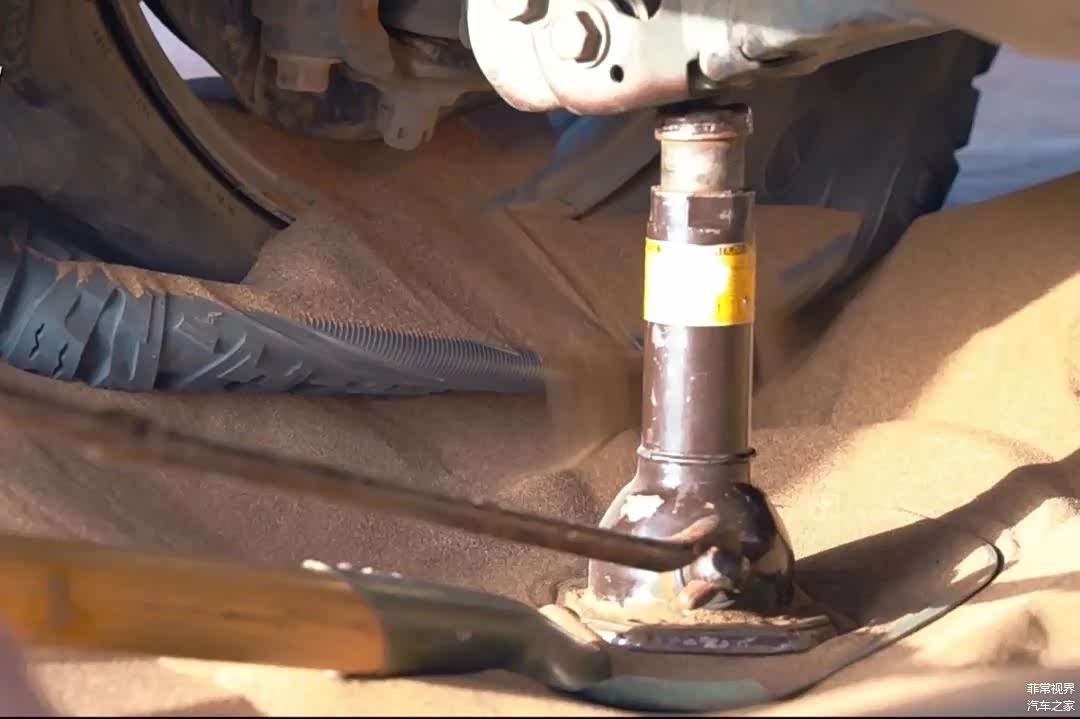 首先我们先要用千斤顶把车辆顶起来, 由于沙子比较软,我们必须在千斤顶下面垫上硬物以达到支撑作用,这次我们直接用铁锹代替,大家也可以选择使用硬木块等。