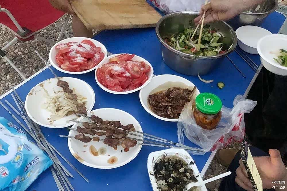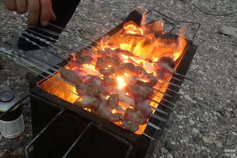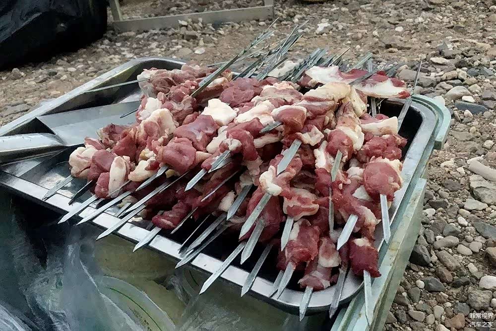 接下来的工作及时各司其职开始准备晚饭,炎热的天气并没有让羊肉变质,这也要归功于陆巡手套箱中的冰箱,切肉、上签子、生火……开烤……