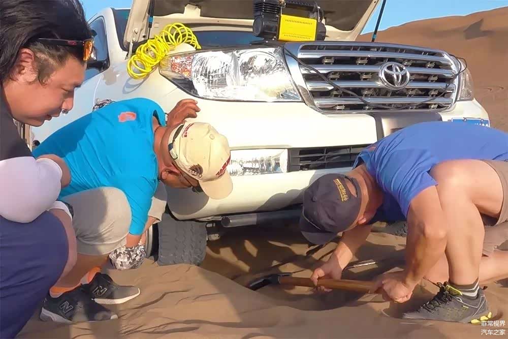 有的时候快乐是要付出代价的,这不一个过猛的转弯,车辆右前轮脱圈了,其实在沙漠中“豁车”,脱圈算是比较常见的一种情况,这回尾箱准备的工具算是派上用场了。