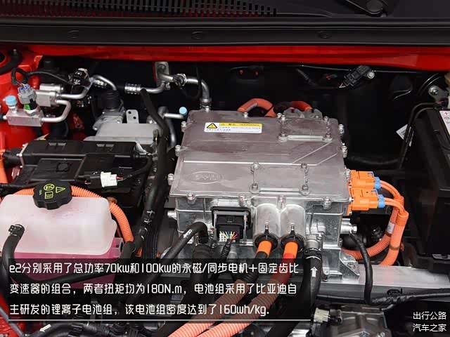 有关动力方面,e2分别采用了总功率70kw和100kw的永磁/同步电机+固定齿比变速器的组合,两者扭矩均为180N.m,电池组采用了比亚迪自主研发的锂离子电池组,该电池组密度达到了160wh/kg,官方宣称该电池通过了过充、火烧、挤压、针刺4重严苛考验,其实大家也都知道,造电池也是比亚迪的看家本领在电能管理及安全性方面不必过于担心.