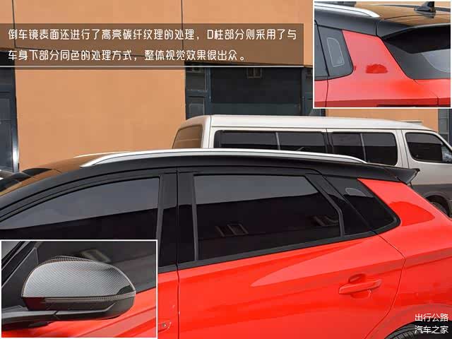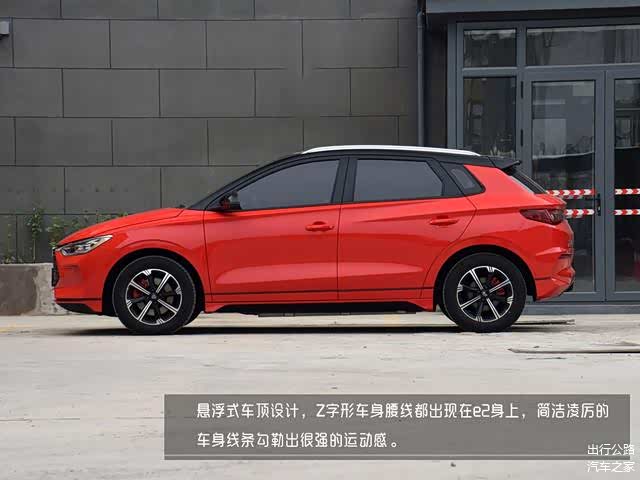 车侧e2采用双色悬浮式车顶设计,它的A/B/C柱上半部分为黑色,从D柱往下和车身同色;下半部分采用了Z字型双腰线设计,我个人蛮喜欢此类设计手法,它能将整个车侧显得修长且立体同时又有着很强的运动感,使车子看上去有种时刻准备冲刺的姿势,战斗气息很足;配合车门上的黑色装饰线条和侧裙,整体视觉冲击效果尤为突出。