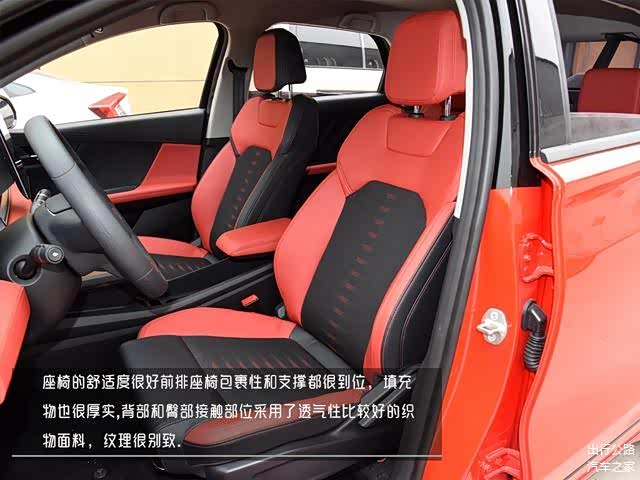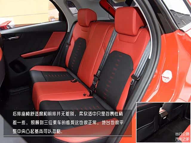 座椅的舒适度很好前排座椅包裹性和支撑都很到位,填充物也很厚实,尤其是座椅的配色同外观一样很运动很战斗,主色调为红黑搭配,但背部和臀部接触部位采用了透气性比较好的织物面料,纹理很别致,我对这种皮料和织物混合搭配的设计方案很认可,不失质感又便于日常打理,主要是在炎热的夏天不捂屁股.储物空间也都ok,手机槽位、中央杯架、门板储物槽应有尽有;不过有一点,门板上方和中控台上部摸起来的手感就要稍差一些,也许出于成本考虑,采用了硬质的环保工程塑胶来代替皮质材料,不过这也符合这个级别车型的定位,再者谁又会没事天天去摸它呢.