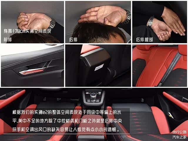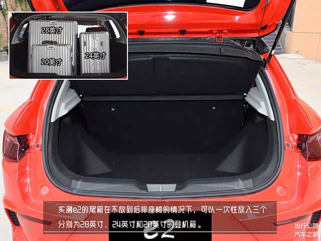 来到车辆后排,座椅舒适度和前排并无差别,柔软适中只是包裹性稍差一些,照顾到三位乘客的感受这也很正常,地台也很平整中央凸起基本可以忽略,这就是电动车和燃油车的区别,少了排气管空间自然更好利用. 根据我们的实测e2的空间表现处于同级中等偏上的水平.美中不足的地方除了中控材质和门板之外就是后排中央扶手和空调出风口的缺失容易让人感觉有点小小的遗憾。