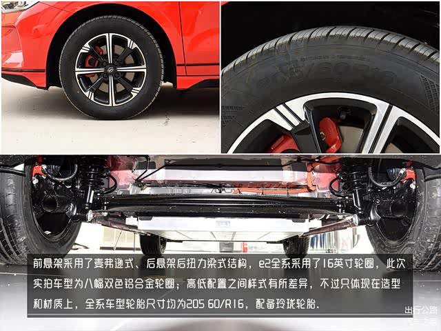底盘结构方面,前悬架采用了麦弗逊式、后悬架后扭力梁式结构,e2全系采用了16英寸轮圈,此次实拍车型为八幅双色铝合金轮圈;高低配置之间样式有所差异,不过只体现在造型和材质上,全系车型轮胎尺寸均为205 60/R16,配备玲珑轮胎。