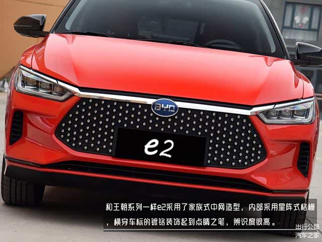 言归正传,咱们先来看e2的外观,第一眼看到e2就被它那迷人且动感的外表所深深的吸引,家族式中网造型,内部采用星阵式格栅,中央镀铬饰条贯穿车标连接左右大灯组,灯腔内部采用了三透镜LED灯源组合,前脸造型层次分明具备很强的设计感。