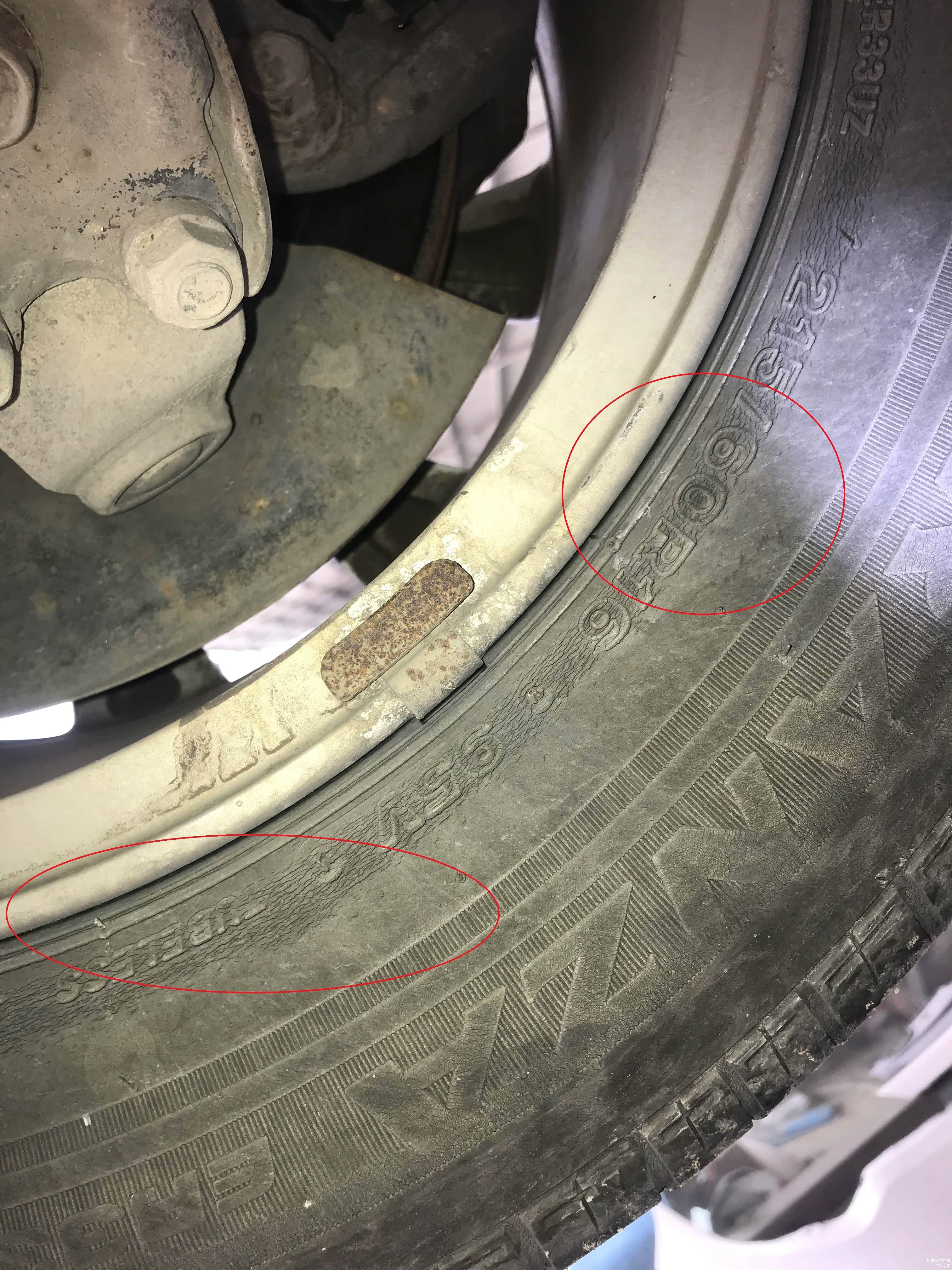 检查底盘先看轮胎,四轮轮胎磨损达到更换标准,偏磨且老化。四轮轮毂不同程度划痕,且有轻微变形。