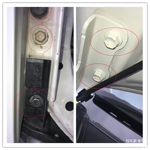 经过一翻漆面细细的检测,发现前机盖拆卸钣金修复,右前门钣金修复,右前叶子板钣金,左前叶子板钣金修复,右后叶子板钣金修复,右后门及门框钣金修复。这伤也是蛮多的,还好没有发现有切割的地方,外观总体来说,还可以接受。接下来该看发动机舱了。