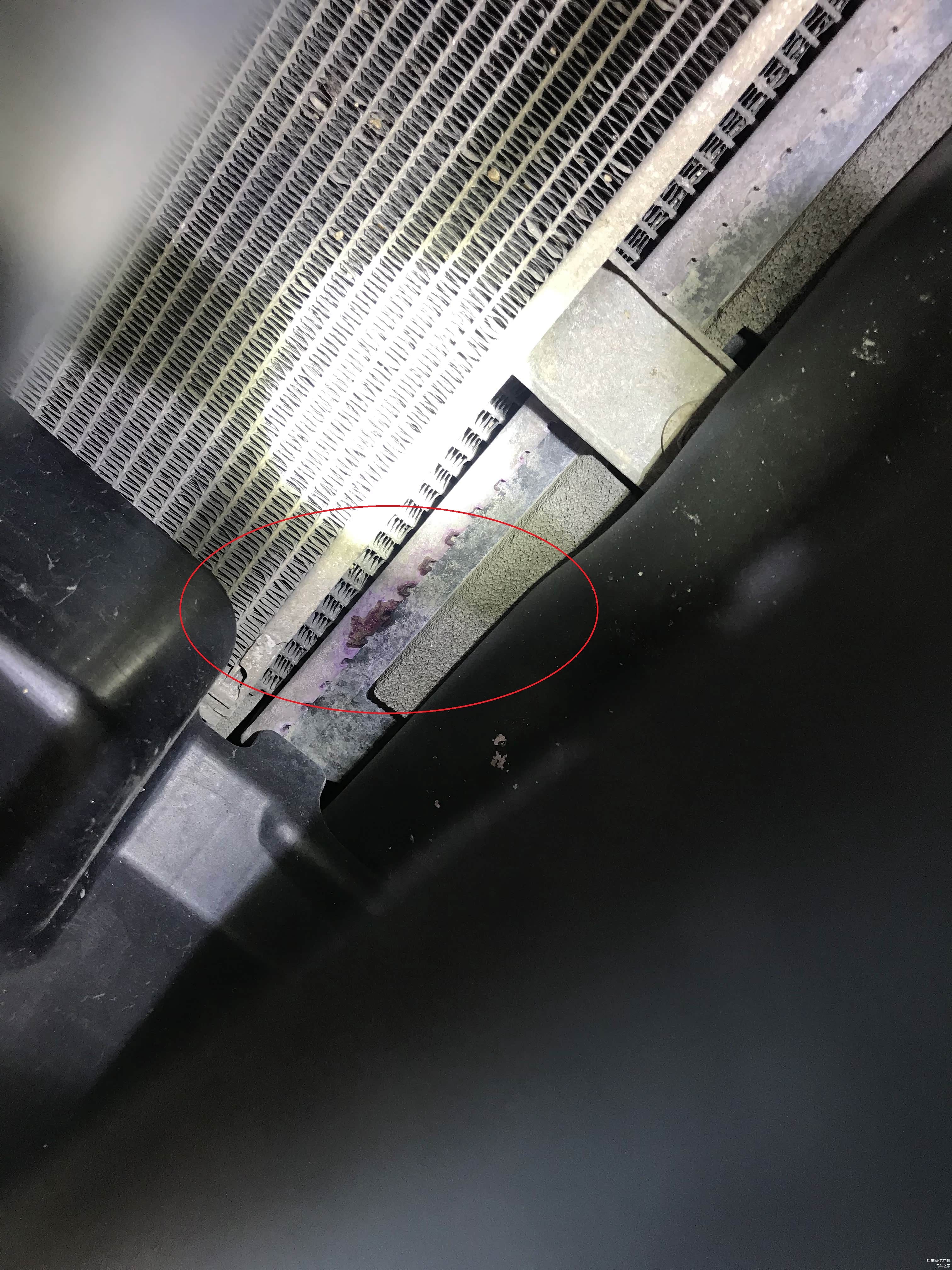 客户说自己前天才做完大保养,油水无异常。不过当查看水箱和冷凝器的时候,发现水箱底部有水迹,看这漏水痕迹,时间很久了。当我把水箱漏水告诉客户时,他说,难怪最近一段时间冷却液液位老是报警,加了几次还是有问题,后尾箱还备着一瓶冷却液,开了那么久今天终于知道原因所在了。
