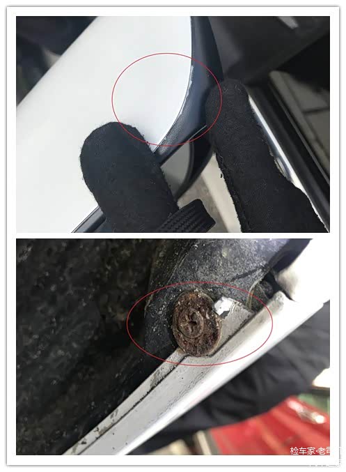 老规矩,先从车身外观开始。绕着全车走了一圈,发现车身多处划痕,全车喷漆,且喷漆工艺较差,到处可见飞漆。前后杠拆卸,且固定螺丝有更换,上面的锈迹很严重,拍个照片记录下来。