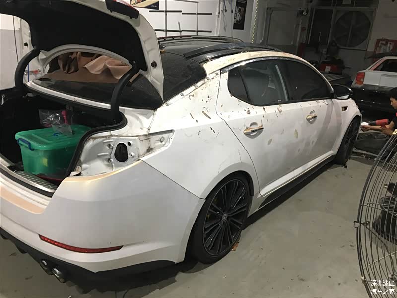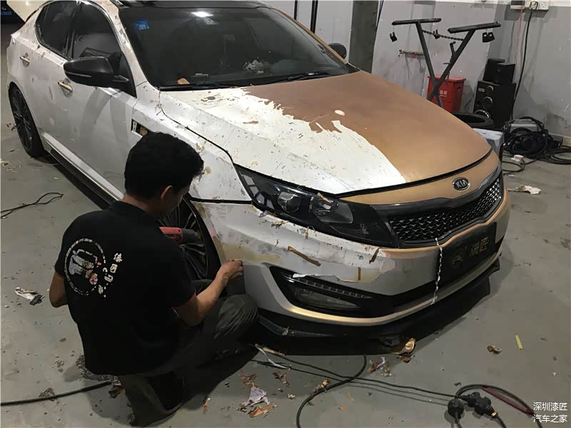 接下来的工作,非常棘手,因起亚K5贴的是劣质膜,全车都掉胶,无法整块撕下来,需要用刮刀一点一点地清除。连续几天需要撕膜/除胶。