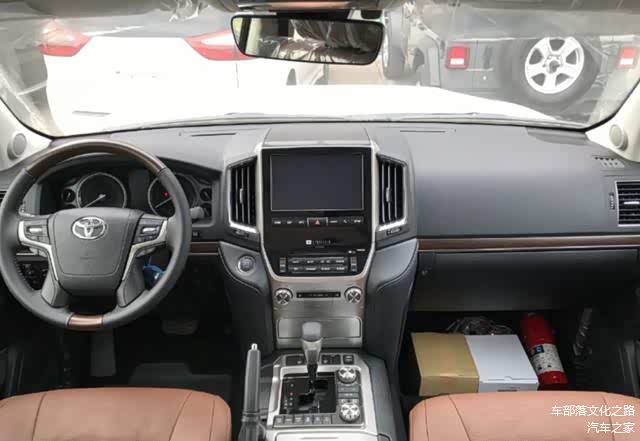内饰方面,这台全新的丰田陆巡车型则变的简谱了许多,我们常见的豪华内饰并没有出现在这款车型上,而是使用了与普通柴油版车型一样的深色内饰风格,而且全新的深色内饰和木纹装饰组合在一起也让整车的内饰风格变得相当沉稳大气,这也很符合这台经典丰田中大型硬派越野车的车型定位!
