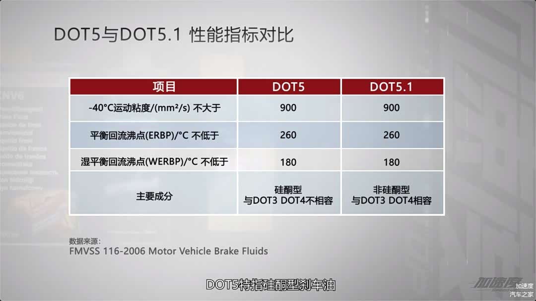 相信很多人都听说过DOT3,DOT4 DOT5.1,他们都是美国联邦机动车标准FMVSS116下的刹车油级别。FMVSS116规定了十几项技术指标,包括外观,运动粘度,平衡回流沸点,pH值,腐蚀性,流动性等。DOT3 DOT4 DOT5.1只在其中沸点和粘度上有区别,其他部分的要求都是完全相同的,可以看到随着级别数字的变大,对刹车油的性能要求也越高。