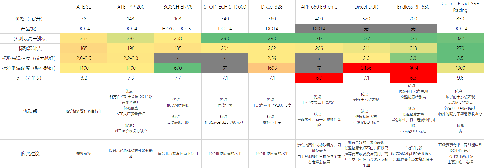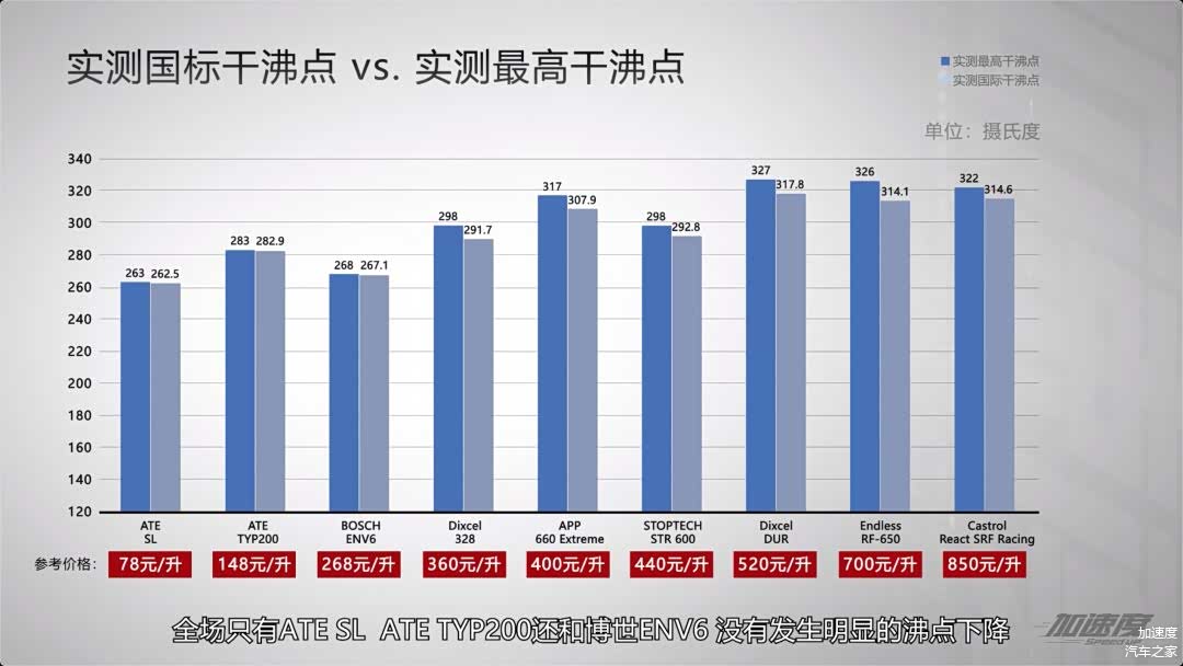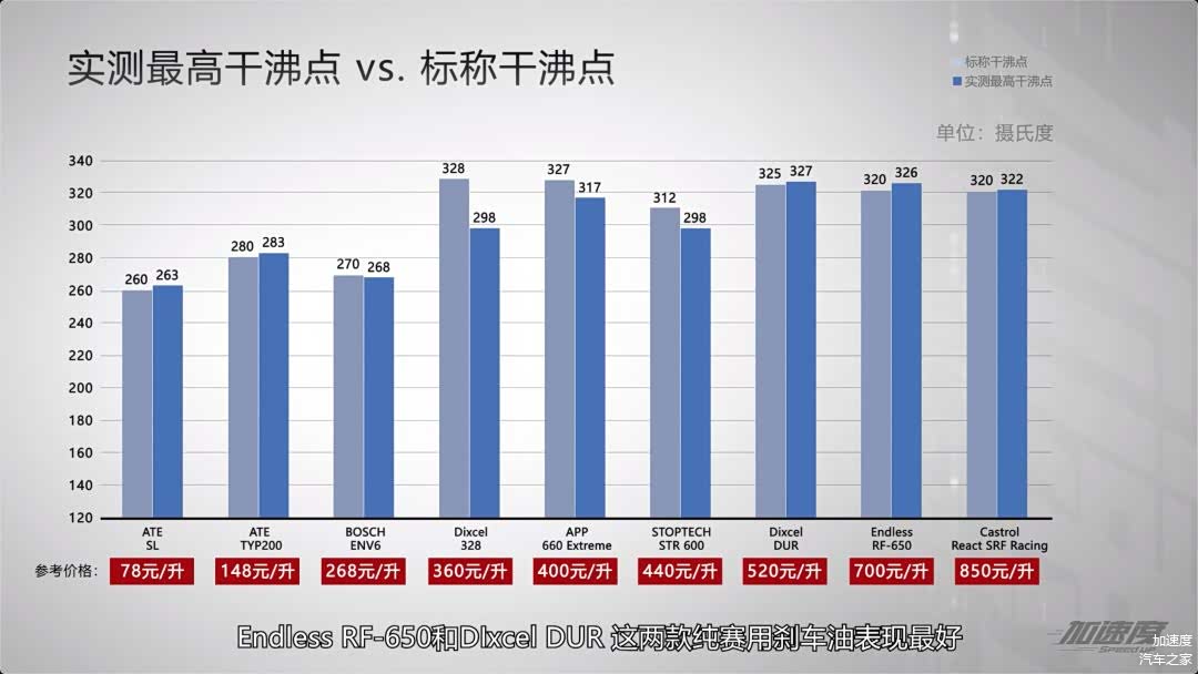 Endless的RF-650和Dixcel DUR这两款纯赛用刹车油的表现最好,最高沸点都超过325度。嘉实多的SRF做为改装圈里的神话,实测沸点为322度。