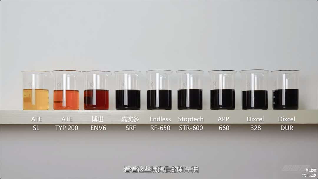 看看这些沸腾后的刹车油,除了ATE和博世只是颜色变深,其他的制动液都变成了黑色的渣渣,光看颜色早分不清谁是谁了。