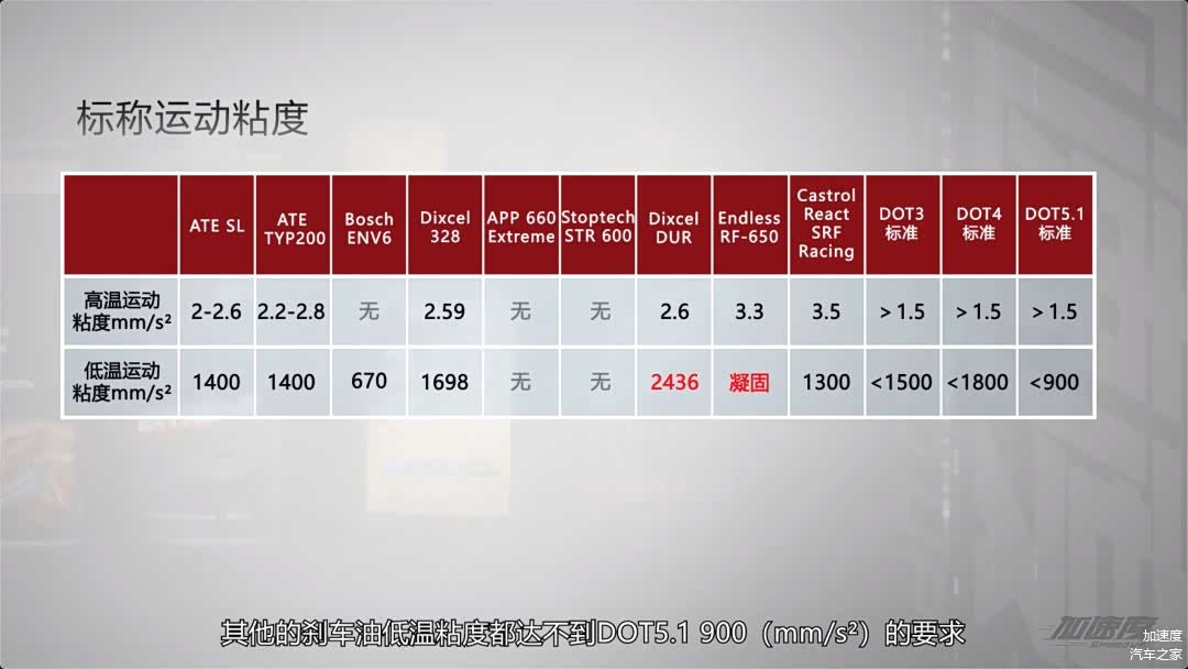 低温运动粘度反应的是-40度,也就是极低温时的性能,我们希望低温粘度小。粘度越高,管路中的粘滞阻力会越大,刹车也会变硬变难踩。当粘度高到一定程度时,甚至会严重影响abs esp的响应速度,说人话就是,ABS和ESP无法正常工作。