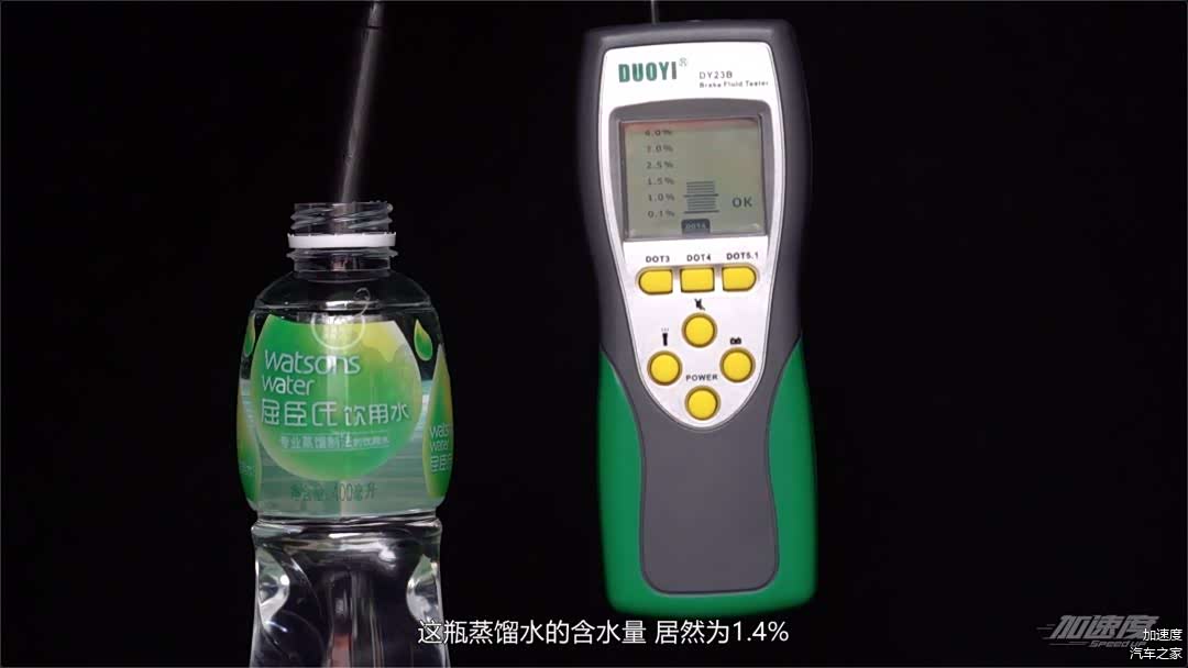 高性能的制动液配方与主流制动液差距较大,所以主流制动液含水量与电导率的关系在高性能制动液上不一定通用,328出厂含水量再高也不可能高到1%,而SRF这种不导电的硅酯型制动液测出0%的含水量则是轻轻松松。制动液的电导率会随着温度的变化而变化,所以不同温度测出的含水量也会有很大区别,你猜测试笔厂家是用什么温度做的测试呢?蒸馏水中的电解质不多,所以电导率也不高,含水量的测试结果也不高。总之,含水量测试笔,在原厂制动液上可能会有比较好的准度,在高性能制动液中几乎没有什么参考意义。