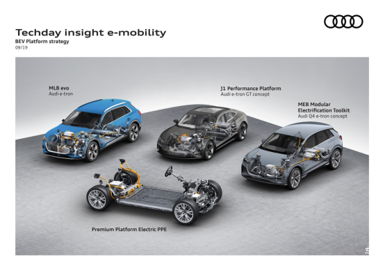 这一关键词集中体现在奥迪目前纯电动产品的平台化布局端。目前,奥迪共有四个纯电动平台:MLB evo、MEB 、J1和PPE。