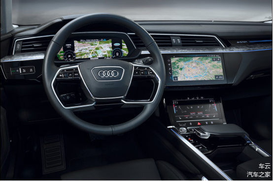 在中控上部显示屏上,驾驶者可以控制信息娱乐、电话、导航和一些奥迪e-tron的专属设置,例如激活充电计时器,能量回收类型,或者是效率辅助功能等。下部显示屏则用于文字输入、舒适功能管理和空调控制。当然,驾驶者还可通过自然语音控制系统来启动其他功能。