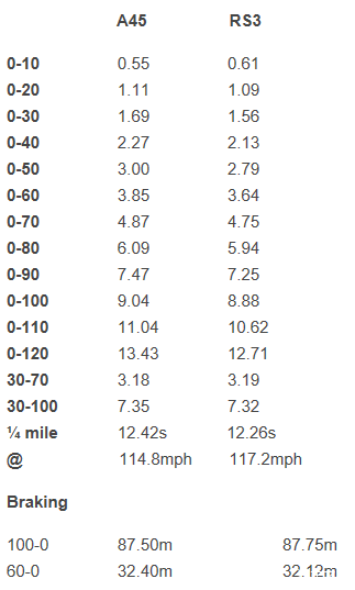 我们可以看到每一个阶段内,两者的阶段时间差几乎都在0.2秒内,而100-0的减速刹车测试,成绩也十分相近,看来新款的地表最强2.0T根本不输多了0.5L排量的RS3 2.5T。