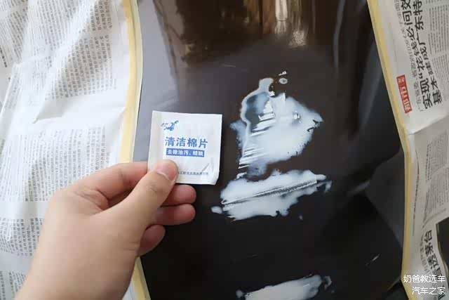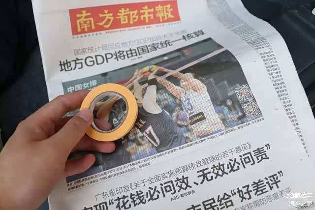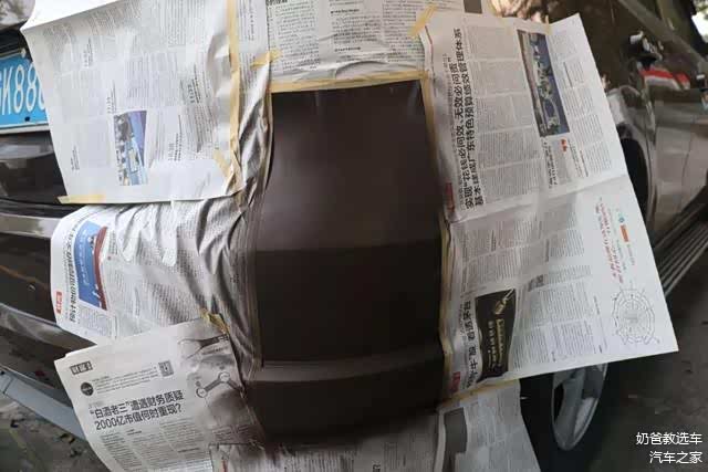 将报纸遮盖刮痕处的四周,并留有一定的富余,防止喷漆后刮痕周边有明显色差,所以必须尽量扩大遮蔽范围。