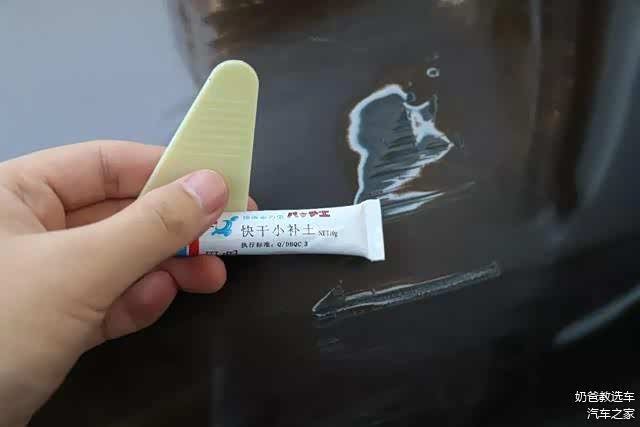 将漆面打磨干净平滑后,清水处理干净后就可以加入快干小补土了。产品就如其名,小补土挤压到刮痕处就很快就干,所以操作一定得利索,其次就是刮痕较深的话,需要等待第一层小补土干了之后,才能再涂第二层,并等待彻底干透。小补土干透的时间与天气有关,像广州这样炎热的天气,经过太阳暴晒后十几分钟就干了。