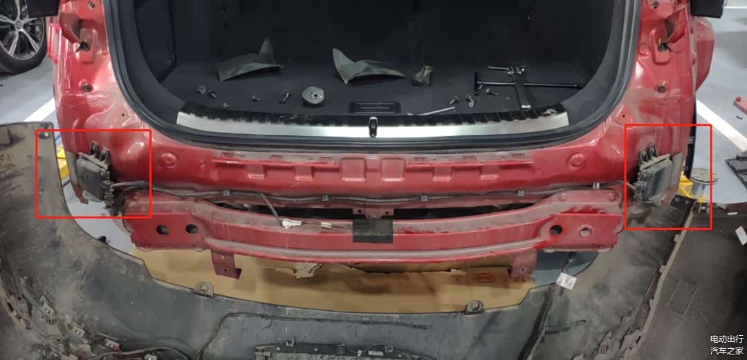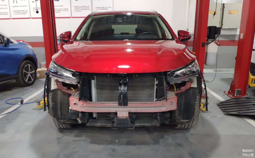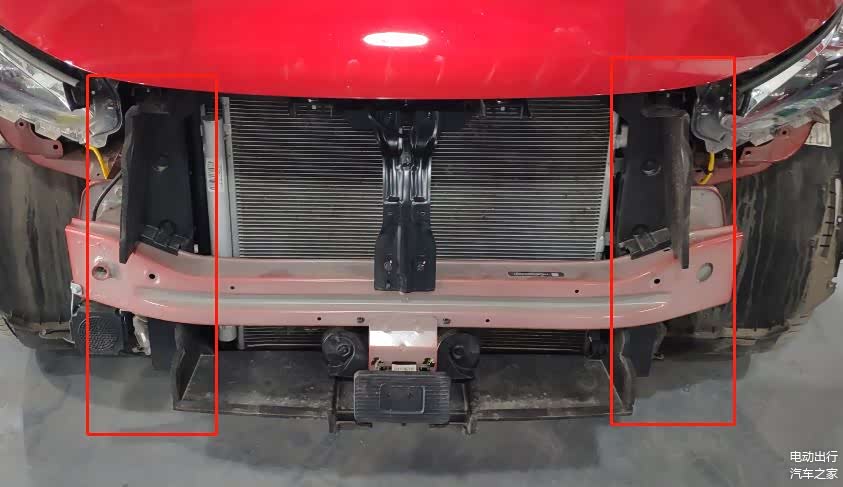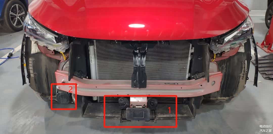 在拆掉唐EV的前保险杠后,就清晰看到它前机舱中的功能性部件。在车头部分,包含有ACC使用的毫米波雷达,低速提示音喇叭等配件。