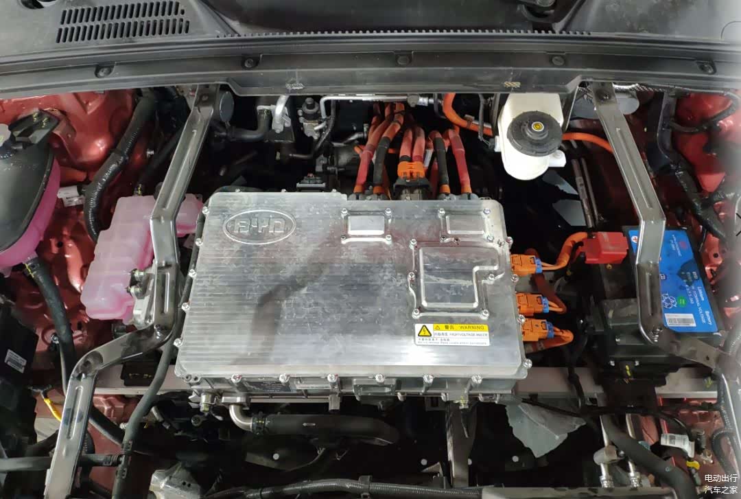 由于和唐DM同尺寸,因此纯电驱动的唐EV前机舱有较大的冗余空间。