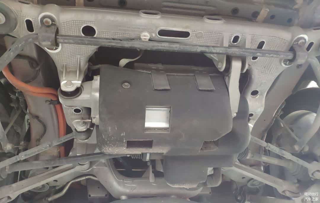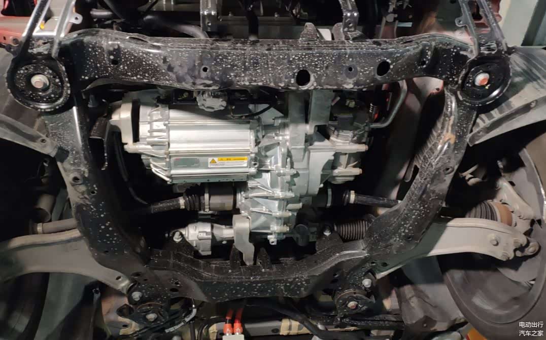 从车底向上看,180kW电动机连通变速箱等配件承托于全框式副车架之上。