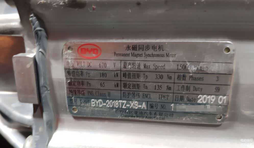 唐EV所使用的BYD-2018TZ-XS-A/B型永磁同步电机,工作电压670V,额定功率65kW,峰值功率180kW,最高转速15000r/min,各项参数均是永磁同步电机中的佼佼者。