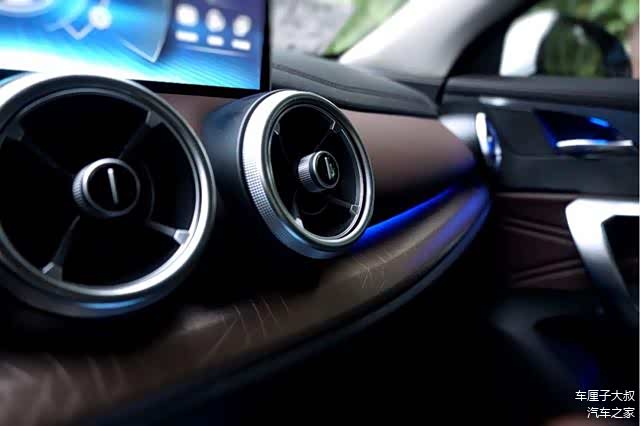 皮质座椅、LED动感氛围灯(蓝色)、电子档把、全景天窗还有手触之处都是软质包裹等,用料非常的厚道。