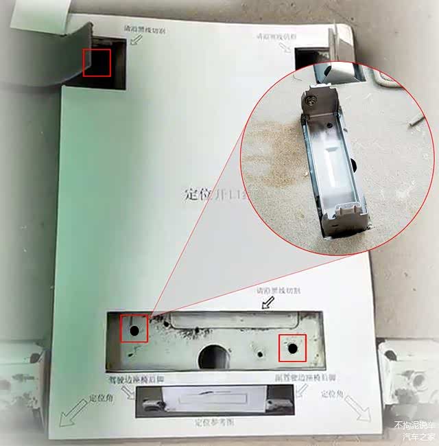 第二步:在通道位置割开地板毛毡,然后将两个扶手箱安装支架通过螺钉固定在地板上。原车已有预留的支架安装螺丝孔,只要找准位置用美工刀将毛毡划开就露出来了。有人会问,我怎么确定要割的位置呢?我又知道地毯下面具体哪个位置藏着原车螺丝孔?不用费心,因为在扶手箱的《安装说明书》中会有一张图纸,把图纸定位在地板上,然后沿着图纸上的线条放心大胆地割下去就准没错。