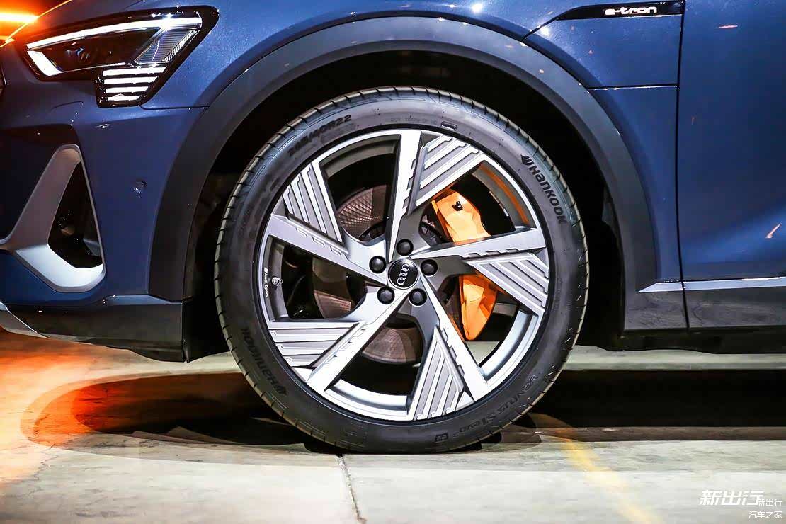 奥迪 e-tron sportback 标配 20 英寸轮毂,支持 22 英寸轮毂。实拍车为 55quattro 版,配有的就是 22 英寸轮毂,搭配上 265/55 R22 尺寸规格的轮胎。
