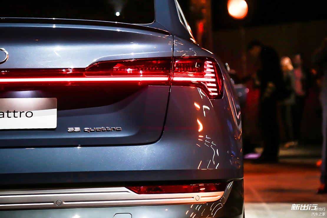 贯穿式尾灯设计同样出现在奥迪 e-tron Sportback 的尾部,这已经是奥迪 e-tron 家族标志性的设计语言。在夜间看奥迪 e-tron Sportback 的尾灯真的是好看。简洁富有科技感的尾部右侧贴有 55quattro 的字样,尾部左侧贴有的则是 e-tron 的字样。
