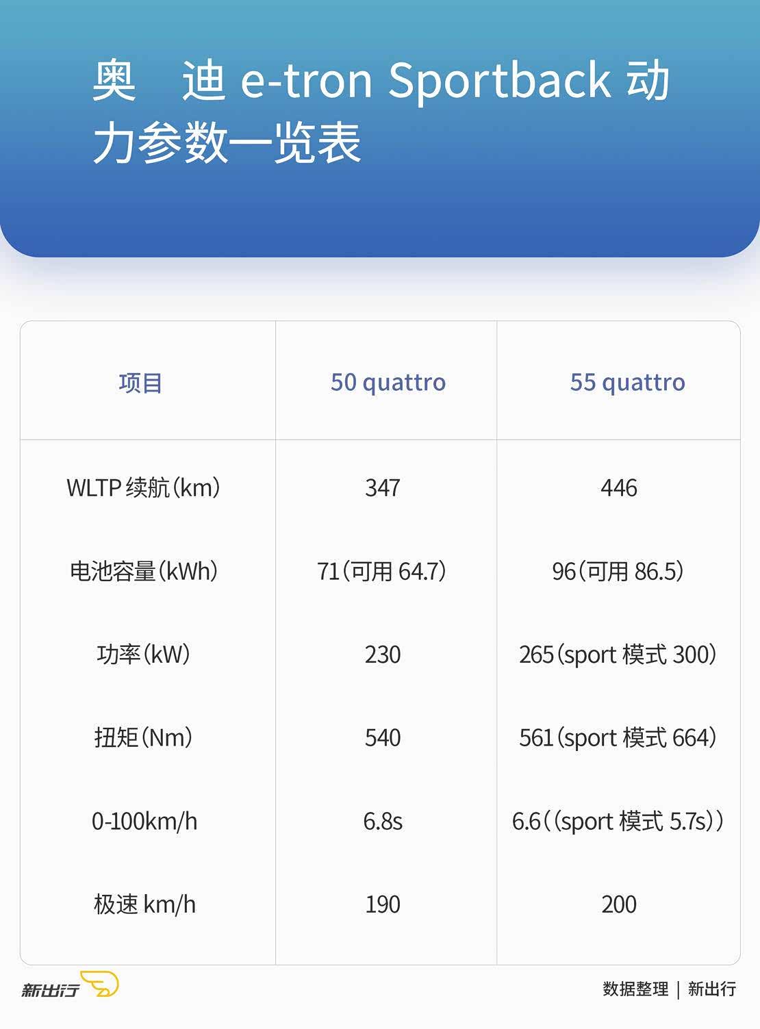 奥迪 e-tron Sportback 提供 50 quattro 和 55 quattro 两个动力版本,其中 50 quattro 版搭载 71kWh 电池 WLTP 续航为 347km,55 quattro 搭载 95kWh 电池 WLTP 续航为 446km;