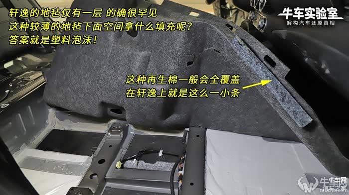 总结:轩逸的地板结构可以用一句话来总结“把成本降到最低,从表面看不出来”。无论是塑料泡沫,还是单层覆盖,或是毛毡垫缺失,从外观都是看不到的。如果说轩逸的定位是家用,那么它缺少了很多舒适性设计,如果真如4S店所言,买轩逸很多人都是去跑滴滴的,那就可以不计较舒适性了,车价越便宜越好,至于配置和设计那就无所谓了。