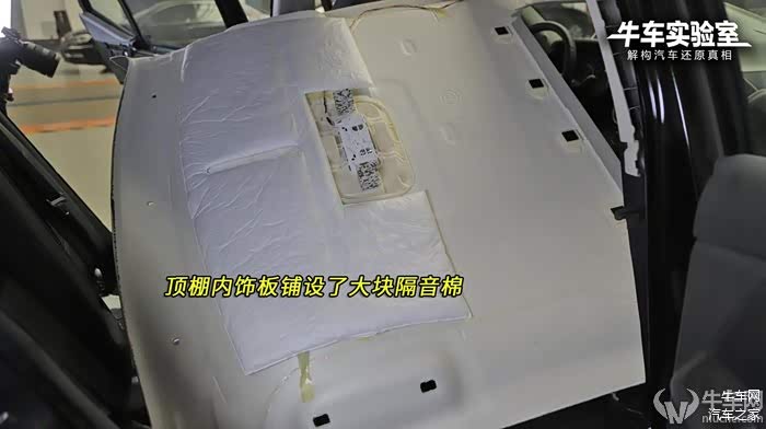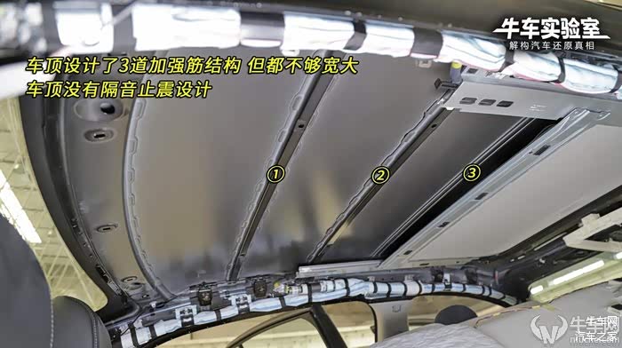 车顶棚方面,轩逸的设计也是比较让人失望。虽然内饰板里有一块较大面积的隔音棉,但是车顶钢板全无隔音止震贴,怎样的信心能让轩逸认为自己的车顶不会发生共振?再看3道较窄的加强筋结构,周围也没有设计加强板,整个车顶简单到没什么可解读的。