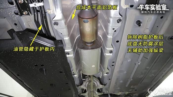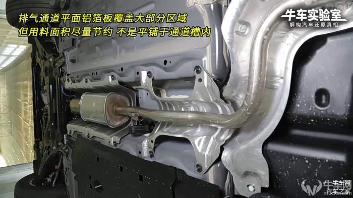 轩逸的底盘中央排气通道,虽然使用了铝箔板隔热层,但不是半球纹铝板,而是平面板材,在散热面积上显然小了不少,而且成本低了一些。这些平面铝箔板并不是完全填充覆盖到通道槽内,而是选择性的围绕着排气管布置,尽量节约材料成本。