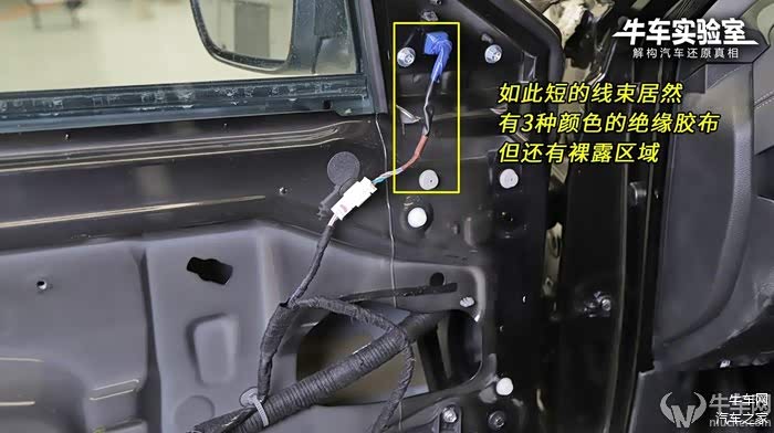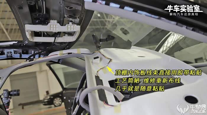 车顶棚内的线束布局也是比较随意,完全手工粘贴胶带固定,甚至都没有专门设计打胶的槽。如果维修顶棚,再重新布线,基本上就是随意贴回去。线束也不存在任何的防护措施。