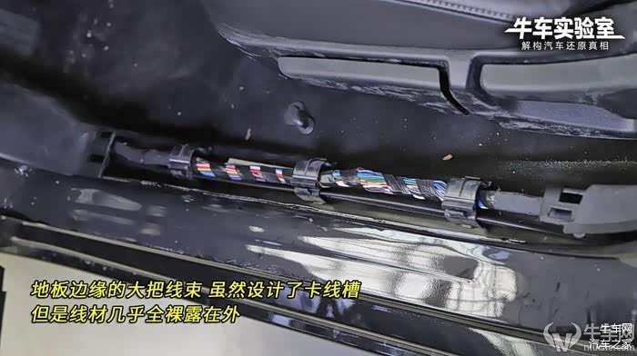 地毡仅有一层,下面的线束还没有什么防护,在车里喝饮料要当心了。有液体洒了还真是比较危险,地板没有防水防潮层,要是造成线束周边有湿气可不是什么好事。