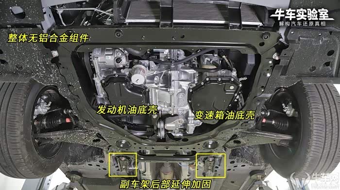 发动机油底壳与变速箱油底壳距离较近,机油滤清器(白色圆柱体)也在此处,保养换油时比较便利。在全框式副车架的后部,还专门设计了两道金属加强结构。