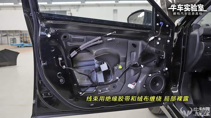 一体冲压的车门板在日系紧凑级车型上的确比较少见,这也代表了厂商对于成本控制的“决心”。而关于防水层,同级别很多车早已使用树脂板,不仅防水效果更好,也能提升门板的密封性,较少噪音。门板内的线束,局部有裸露,整体都没有使用波纹管,仅用绝缘胶布和绒布缠绕。