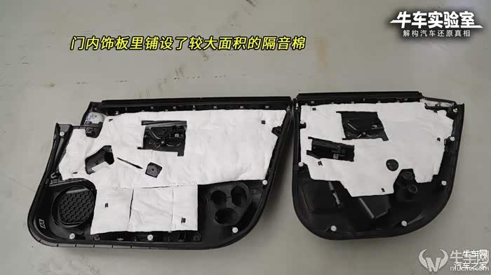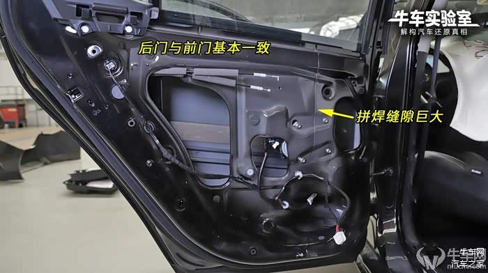 后门和前门基本一致,但是没有出现丁基胶止震贴。此外,我们可以发现,前后车门内的圆形钢主防撞梁设置的位置都是比较低的,并没有采用对角斜置的方式,这也是可以降低一些成本,减少了材料的长度。而位置较低也并非没有优点,在发生侧面碰撞时,可以让门板下部承受更大的撞击力,保护车内人员腿部。