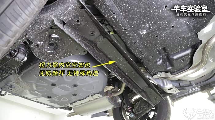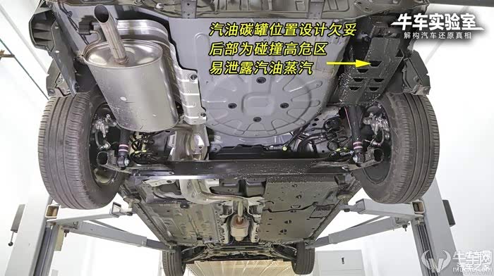 扭力梁内无防倾杆,也是将这种简单的结构,再一次推向了极致,甚至是极端简陋。而在车尾部我们发现了汽油碳罐,原本应该位于油箱附近,然而却出现在这里,有点令人不解。尾部一角显然是碰撞追尾的高危区域,虽然不会引发多么严重的后果,但碰撞到此处,会有汽油蒸汽泄露,严重时可能导致油箱内压力改变,车辆无法正常行驶。