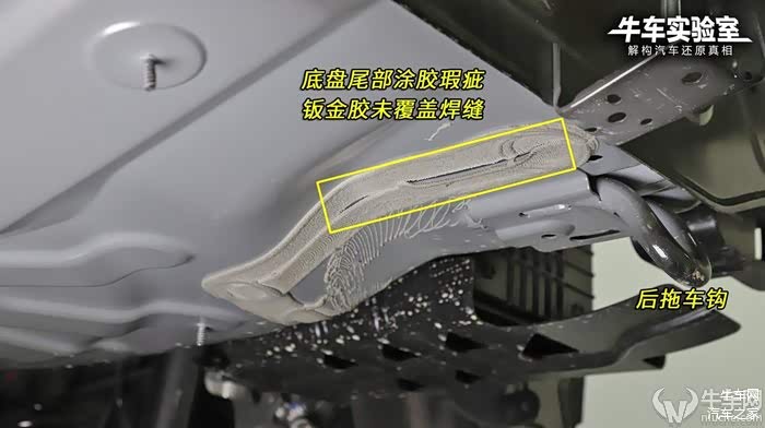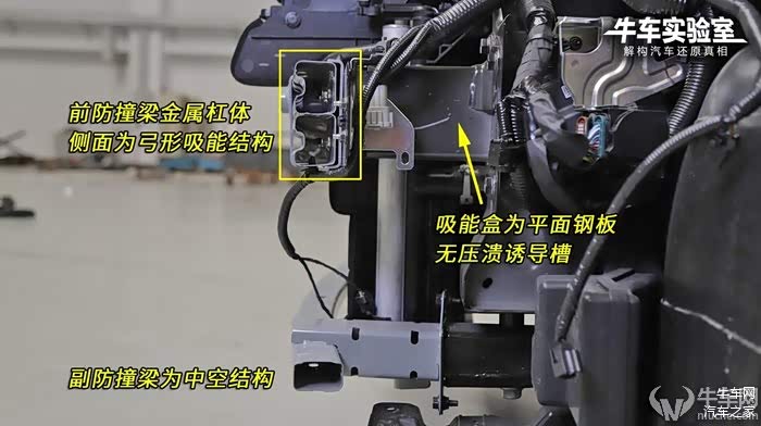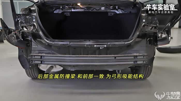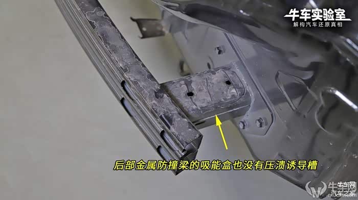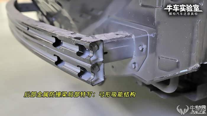 后防撞梁的吸能构造,也是和前防撞梁一样的弓形结构,同样,其后部吸能盒也没有设计压溃诱导槽,碰撞吸能效果会大打折扣。