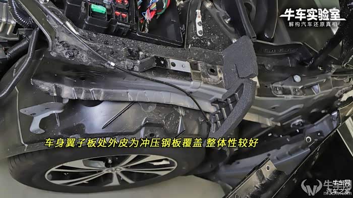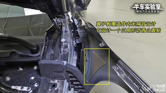 翼子板设计方面,车身上的外皮是一体冲压工艺的钢板材料,整体性还不错,没有出现拼接的痕迹。而外蒙皮这一侧,内部仅有一个三角形的沥青止震贴片,除此之外再无其他的东西了,隔音棉什么的也没有设计。翼子板内也没有空腔结构,整体来说比较简单。