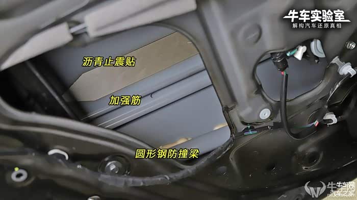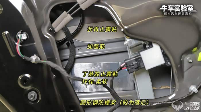 前门内的安全结构设计:圆形钢防撞梁,加强筋,沥青止震贴,丁基胶止震贴。唯一值得表扬的是丁基胶,成本高,环保且柔软无异味。圆形钢防撞梁,如今来看已经是很落伍的一种防护结构了,成本低廉,防护效果一般,被广泛应用于低端车型上。